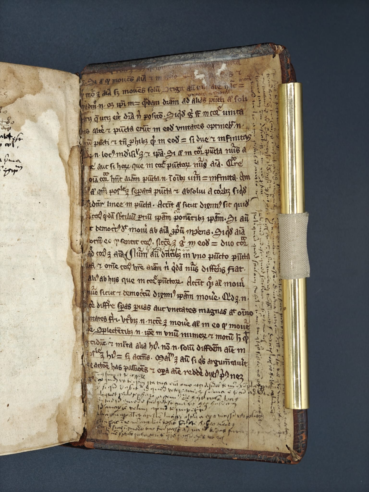 Single leaf bound in as pastedown (170 x 100 mm). 24 lines of primary text, with later marginal annotation surrounding. Ruled in ink. 7-shaped uncrossed Tironian et; est abbreviation; = for esse. Thorny, sloped d; two compartment a. Likely used in a University setting.