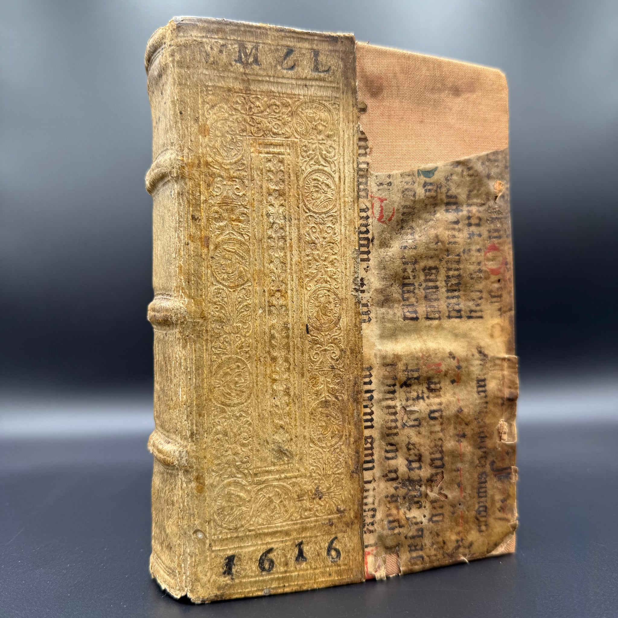 pp. [44], 524. α7 wants 1, β8, 78, a-z8, A-K8, L3. Lacks title page. Each of the 8 books opens with 8-line inhabited initial, with 5-line inhabited initials throughout. Extensive contemporary 16th century marginal annotations and underlining from at least 3 campaigns in black, brown and green inks. Bound in three quarter alum tawed pig skin with decorative blind rolls and blind stamped with rondelles of scholars, including Erasmus; monogrammed MZL and dated 1616, incorporates 14th century Swiss liturgical manuscript leaves as front and back cover and front pastedown. Back pastedown consists of two columns of leaf from ca. 1520 Martin Luther small tract, Ein Sermon von dem Gebet und Procession in der Crützwochen. Manuscript and print binding waste over canvas, likely from 19th century stabilization effort. Manuscript chipped. Fore edges in blue. Overall GOOD condition.