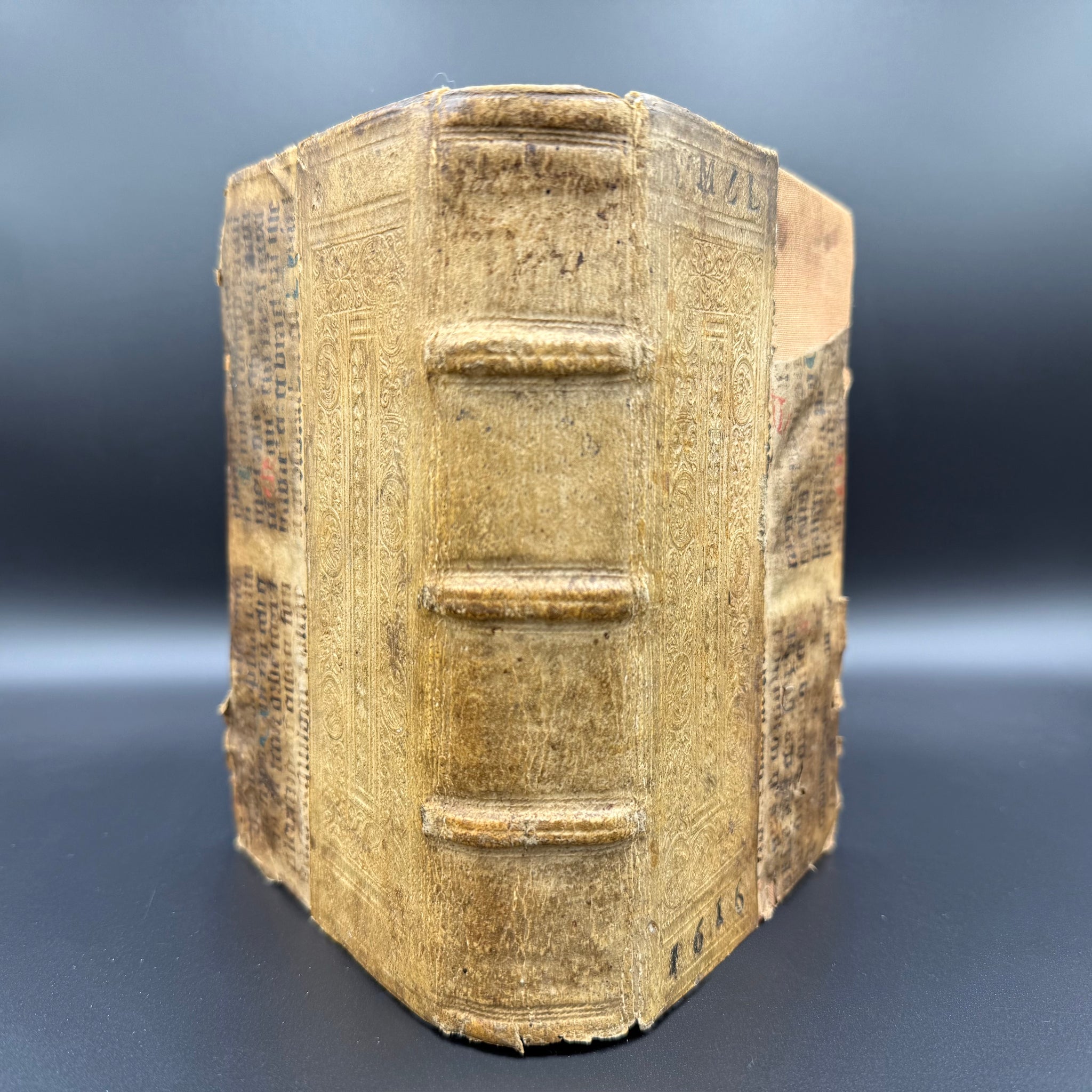 The binding of this 1546 Basel edition—printed during Polydore Vergil’s lifetime—beautifully captures a world on the brink of transformation. It brings together medieval devotion and Reformation-era thought beneath an alum-tawed, blind-stamped pigskin binding, a style widely used in the German-speaking regions of the 15th and 16th centuries.
