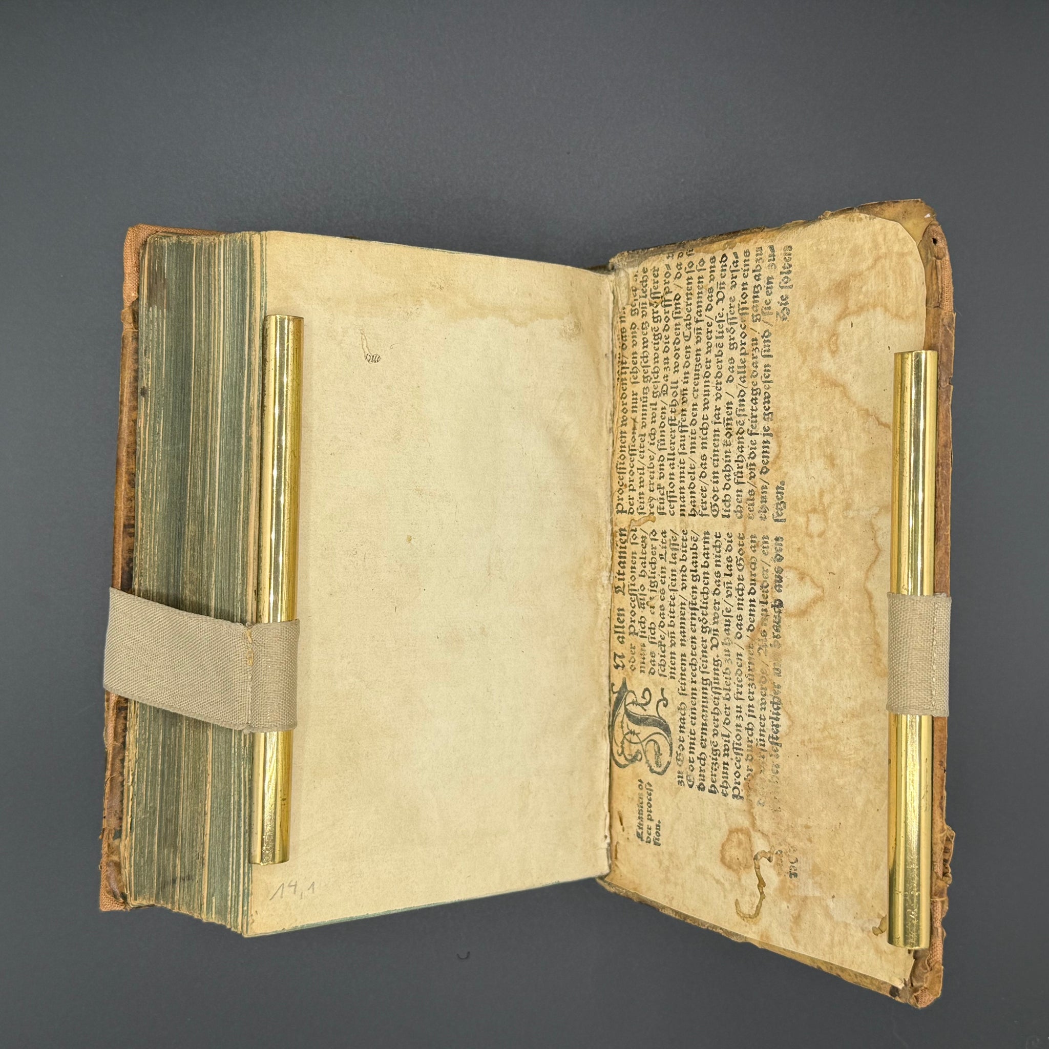 A medieval Swiss manuscript leaf is preserved within the binding, creating a striking visual and intellectual contrast with the clean, contemporary lines of the pigskin cover. Even more evocative is the inclusion of a fragment from a pamphlet by Martin Luther (1483–1546), anchoring the book firmly in the religious upheavals of its time. This layered construction speaks directly to the cultural tensions the text itself would later provoke—tensions that ultimately led to its placement on the Index Librorum Prohibitorum for its criticism of Catholic doctrine.