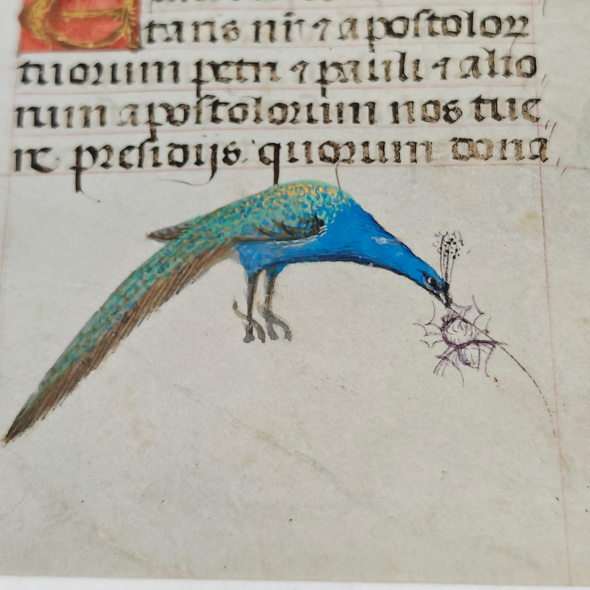 Bruges or Ghent, ca. 1500. Possibly attributable to Cornelia van Wulfschkercke. (125 x 85 mm) Latin. Single leaf from Book of Hours. Single column witht three 2-line initials on recto and verso with decorative gilt penwork on coloured backgrounds of pink, blue and green. 17 lines of Gothic rotunda with uncrossed Tironian et, hairlines on a and decorative hairlines on large initials, some ascenders have thorns and bifurcations, some descenders have bifucations. Gothic formata elements such as diamond pedes, but letter forms are rounded rather than typical Gothic angular form and less severe fusion throughout. Penstroke crosshatches at end of lines indicating broken words. Rubricated in pink. Recto is likely from Prime of Hours of the Virgin, likely Use of Rome. Marginal illustration of peacock eating spider and butterfly on thistle. High quality, thin and creamy parchment with minor marginal browning. Housed in passepartout, unmounted. German description in modern pencil along bottom border of passepartout, with numbers collector’s code. Likely from the collection of Roger Martin (1939-2020). MB657/MSB7v