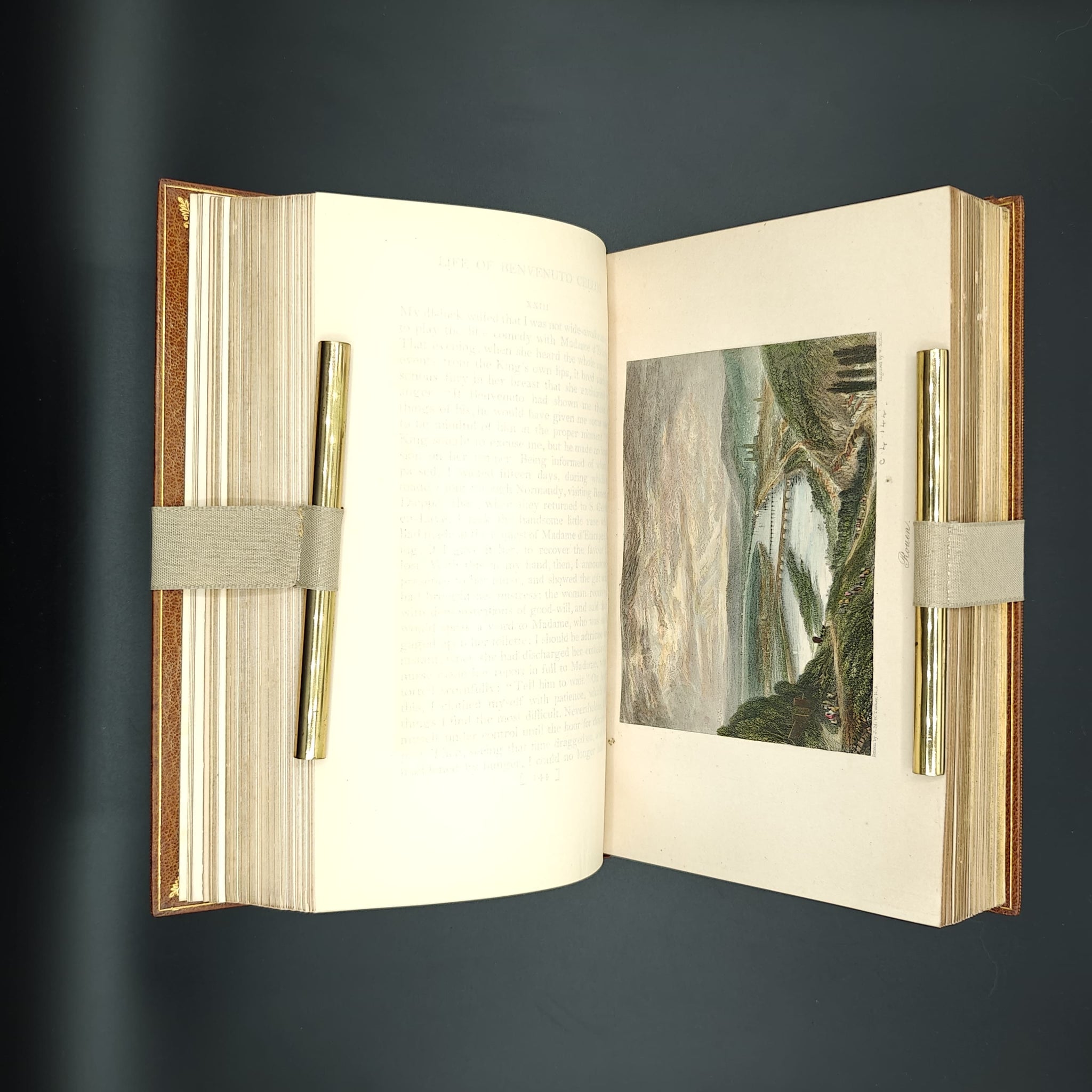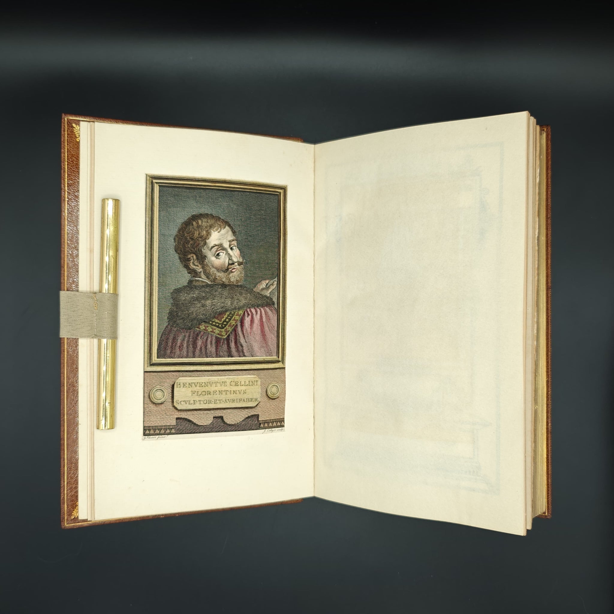 Vol II: Castle and bridge of S. Angelo Rome (copper plate) as frontispiece; Savonarola (tipped in on passe partout) 14; Pious II (tipped in on passe partout) 36; Colummn of Phocas (copper plate) 72; Cour des Fountaines (folded plate) 110; Leonardo da Vinci (steel plate) 116; Duchess d'Etampes (steel plate) 124; Charles, Cardinal de Lorraine (copper plate) 126; Vue Pont Neuf (tipped in on passe partout) 128; Palace St Germain (steel plate) 136; Rouen (steel plate) 144; Il Rosso (tipped in on passe partout) 150; Giotto (tipped in on passe partout) 152; Boccaccio (copper plate) 158; Il Gabinetto (bifolium steel plate) 174; Diana of Poictiers (steel plate) 190; Marguerite de France (tipped in on passe partout)198; The Tribune (bifolium steel plate) 214; Philip I I of Spain (rose tinted steel plate) 220; Benvenuto Cellini (steel plate) 232; Michaelangelo (steel plate) 270; Baudinelli (copper plate) 294; Andrea Verrocchio (tipped in on passe partout) 296; Giovanni Agnolo Montorsoli (tipped in on passe partout) 298; Lorenzo Ghiberti (tipped in on passe partout)312; Le roi Henri II (tipped in on passe partout) 344.
