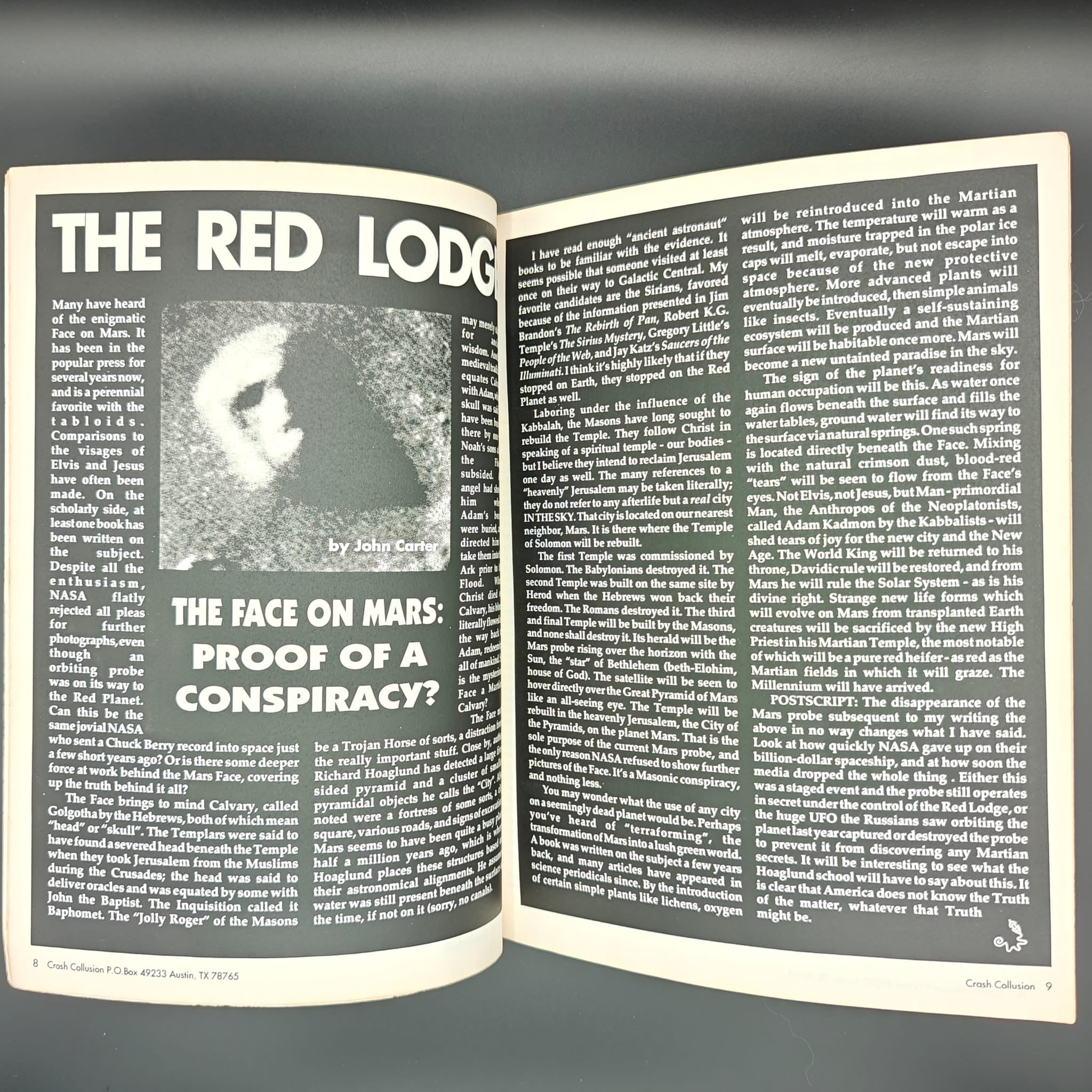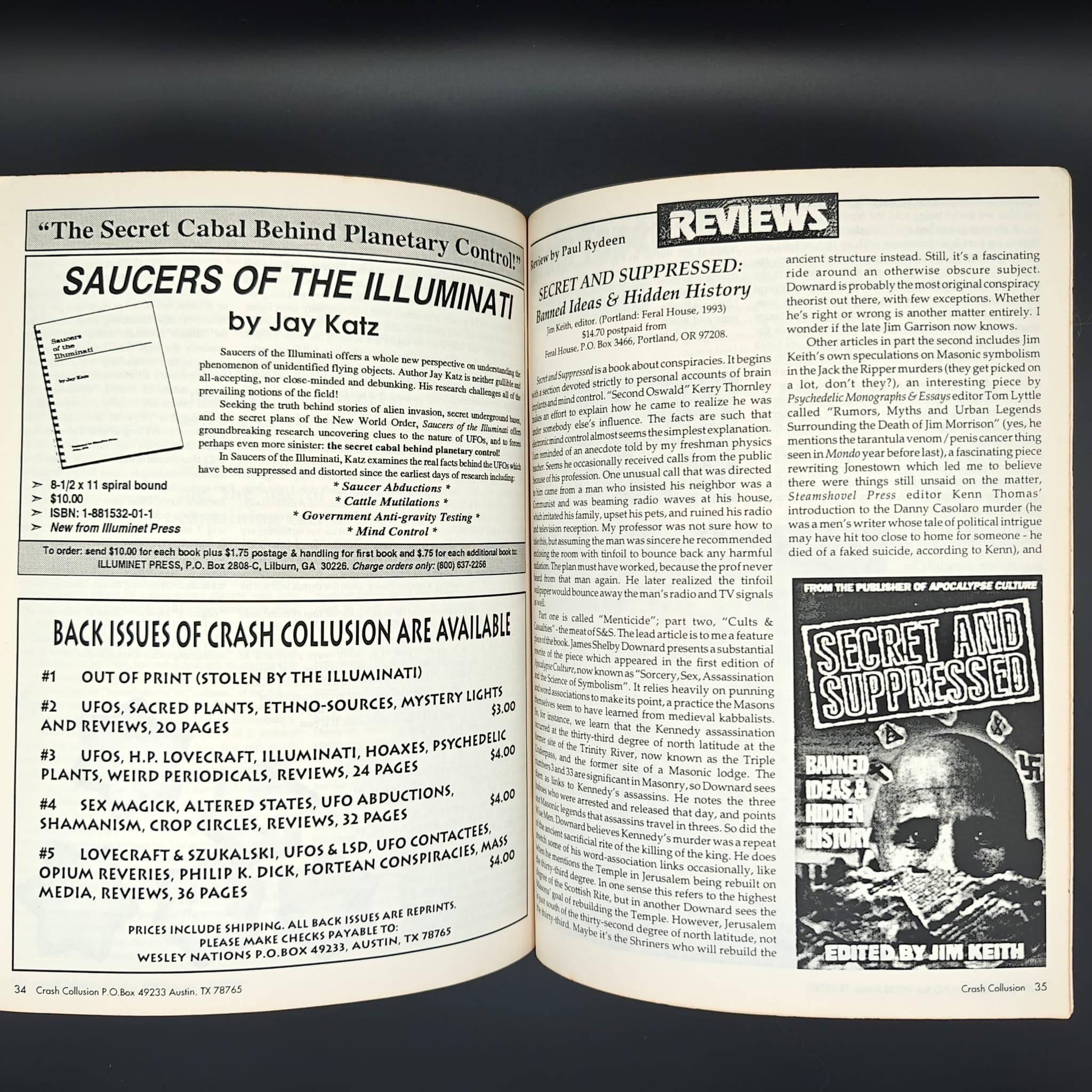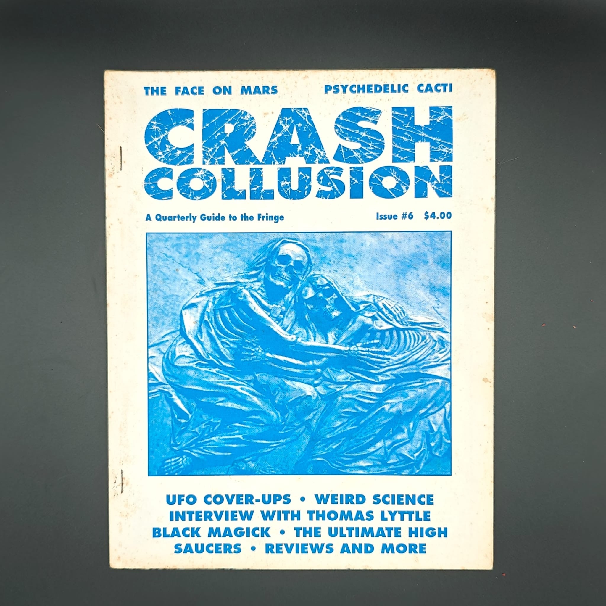 pp. 42. Crash Collusion, A Quarterly Guide to the Fringe, a weirdo zine from Austin in the 90s. Bringing us the finest in: the Face on Mars, Psychadelic Cacti, UFO coverups, weird science, interview with Thomas Lyttle, black magick, the ultimate high, saucers, etc. Single staple bound, blue, black, and white, illustrated throughout. Overall VERY GOOD