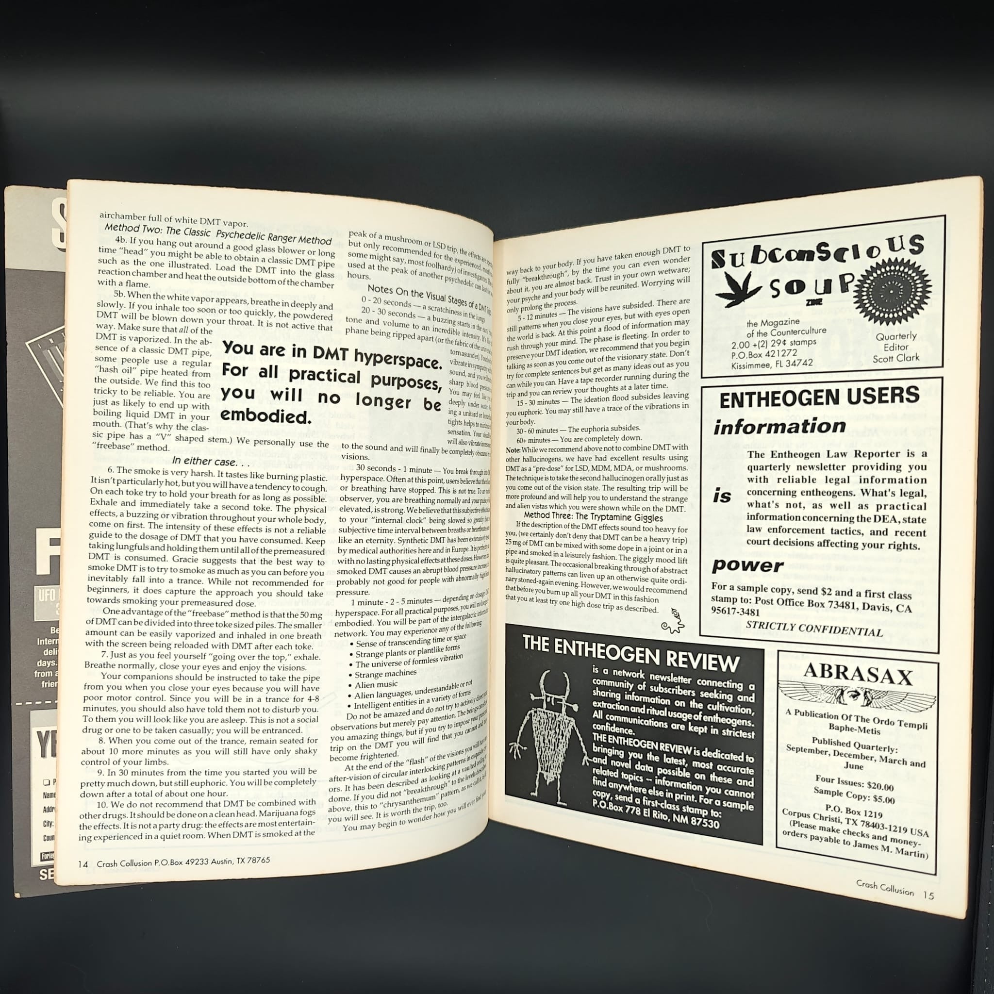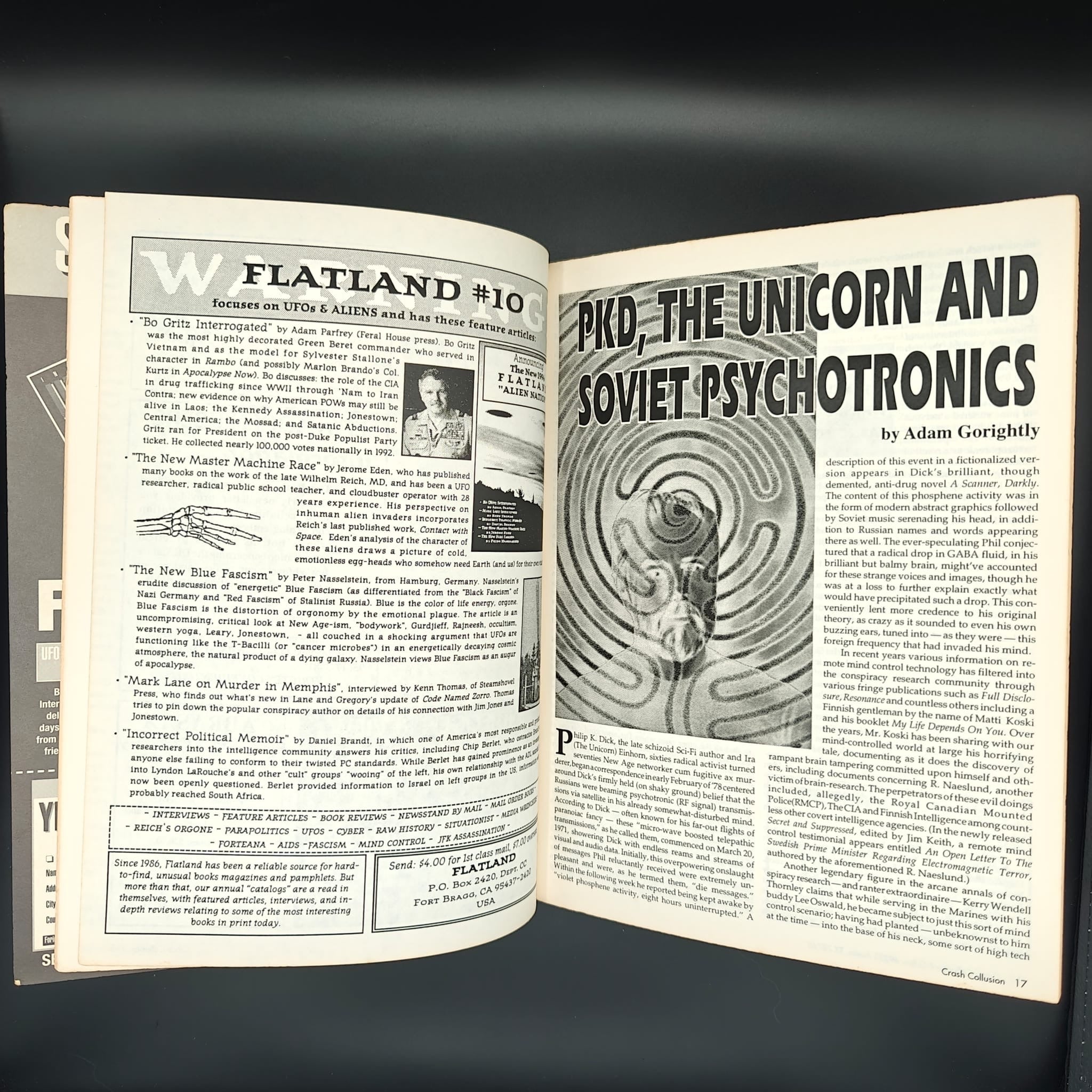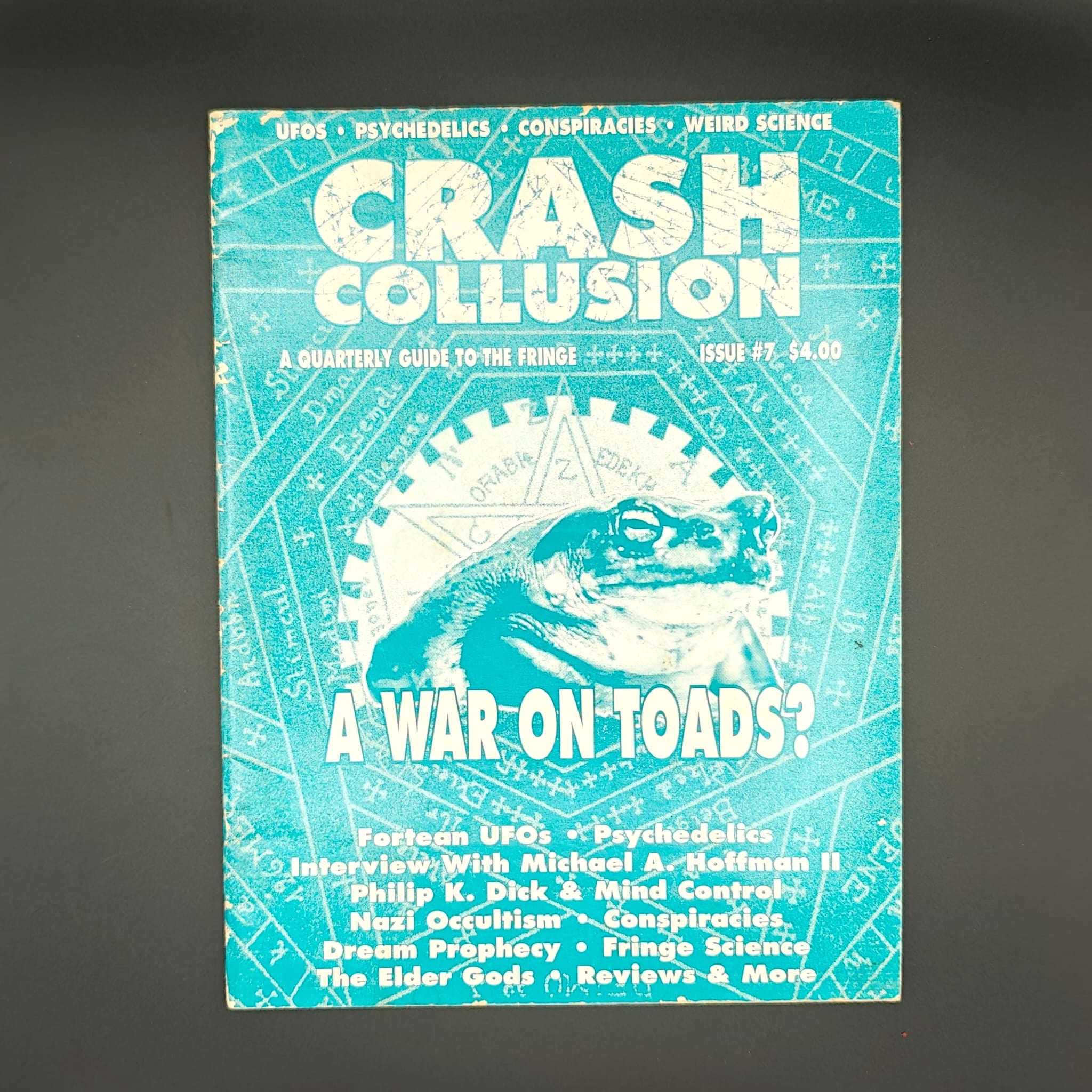 pp. 47. Crash Collusion, getting a bit bigger now with a folded teal-toned cover, double staple bound. This issue features the WAR ON TOADS and Fortean UFOs, Psychadelics, Intervies with Michael A. Hoffman II, Philip K. Dick and Mind Control, Nazi occultism, conspiracies, dream prophesies, fringe science, the Elder Gods. Some scuffint to top corner, but overall VERY GOOD