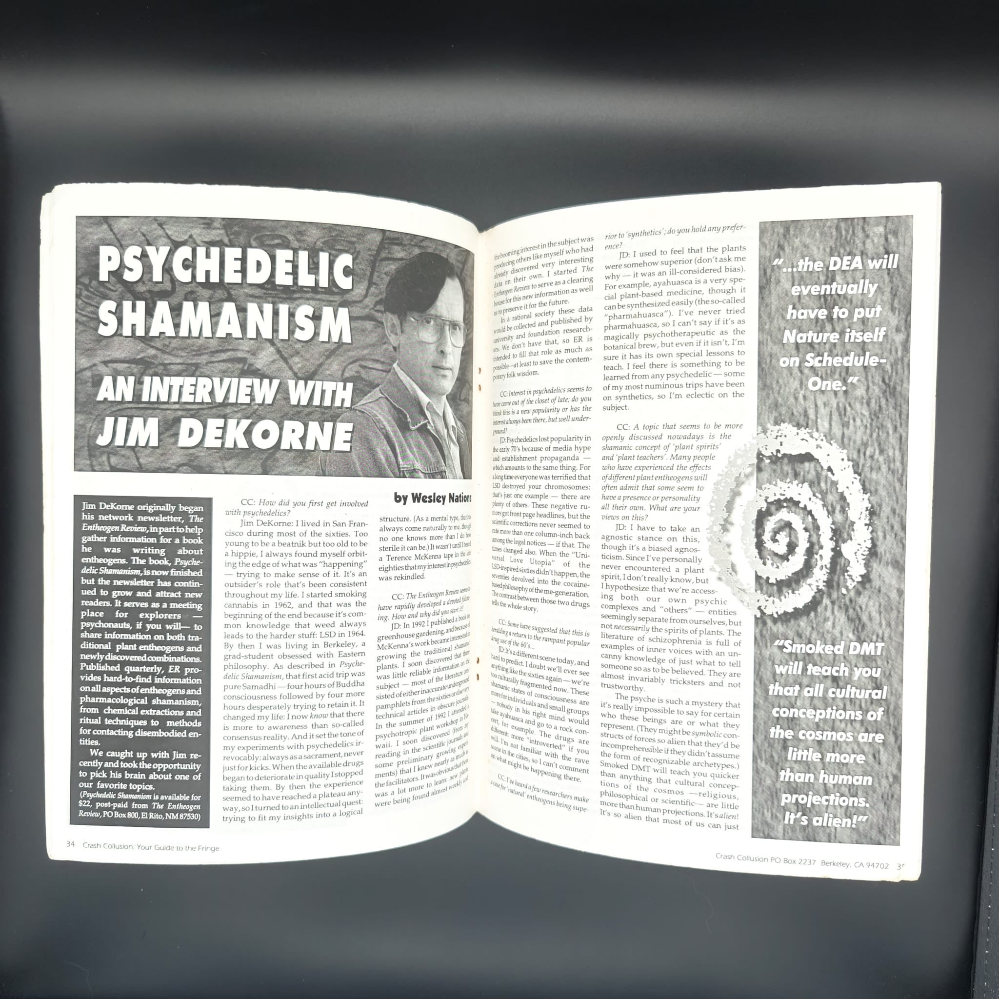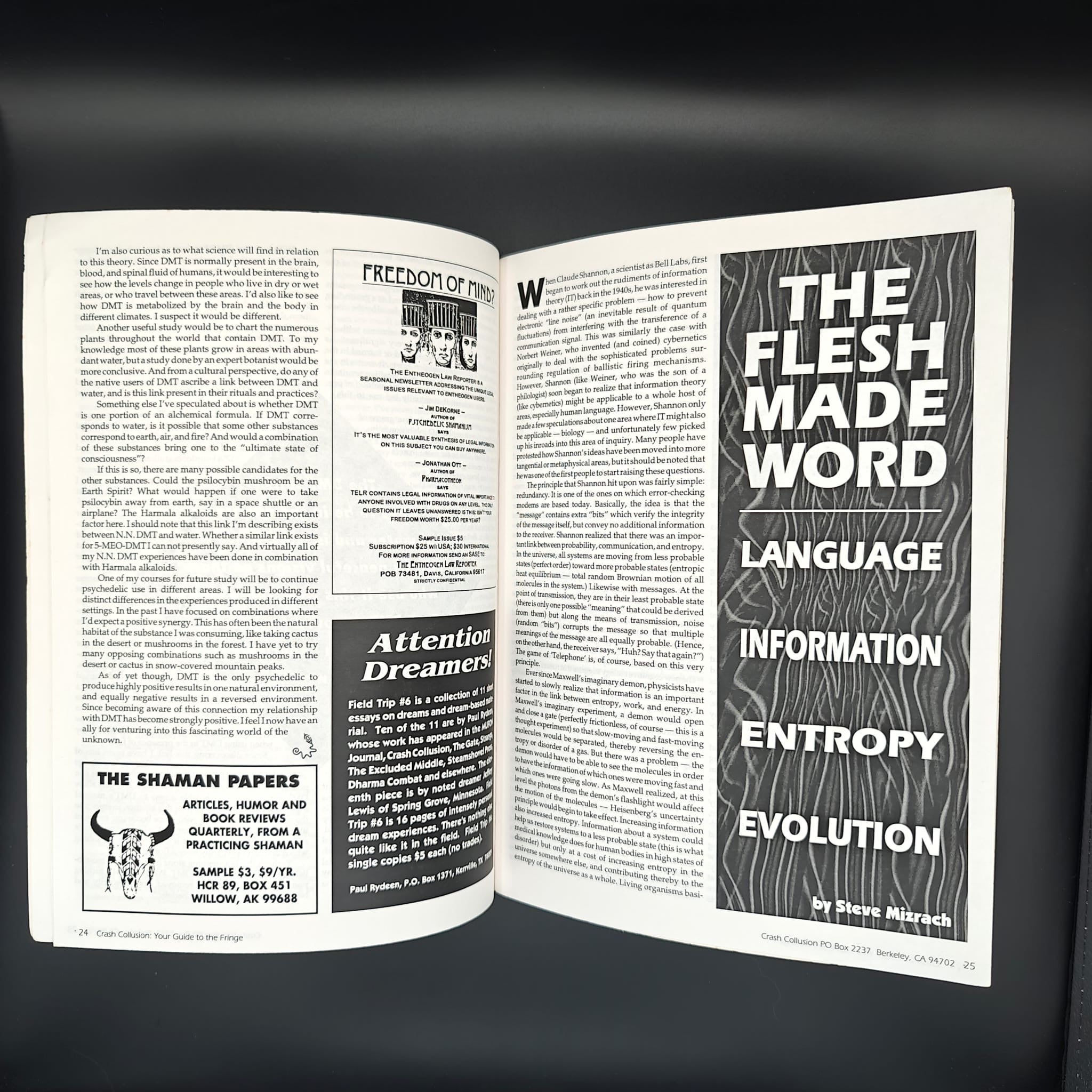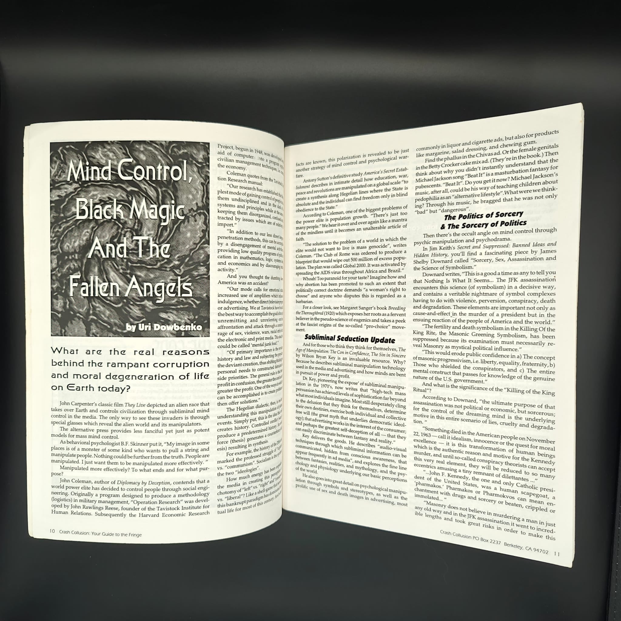pp. 66 Crash Collusion has reached GLOSSY STAGE, with a glossy purple wrap around cover, double stapled, and moved to Berkeley, CA. Still offering up weirdo articles on DMT and the Water Spirit, mind control and black magic, Psychadelic shamanism, etc. Overall VERY GOOD condition.