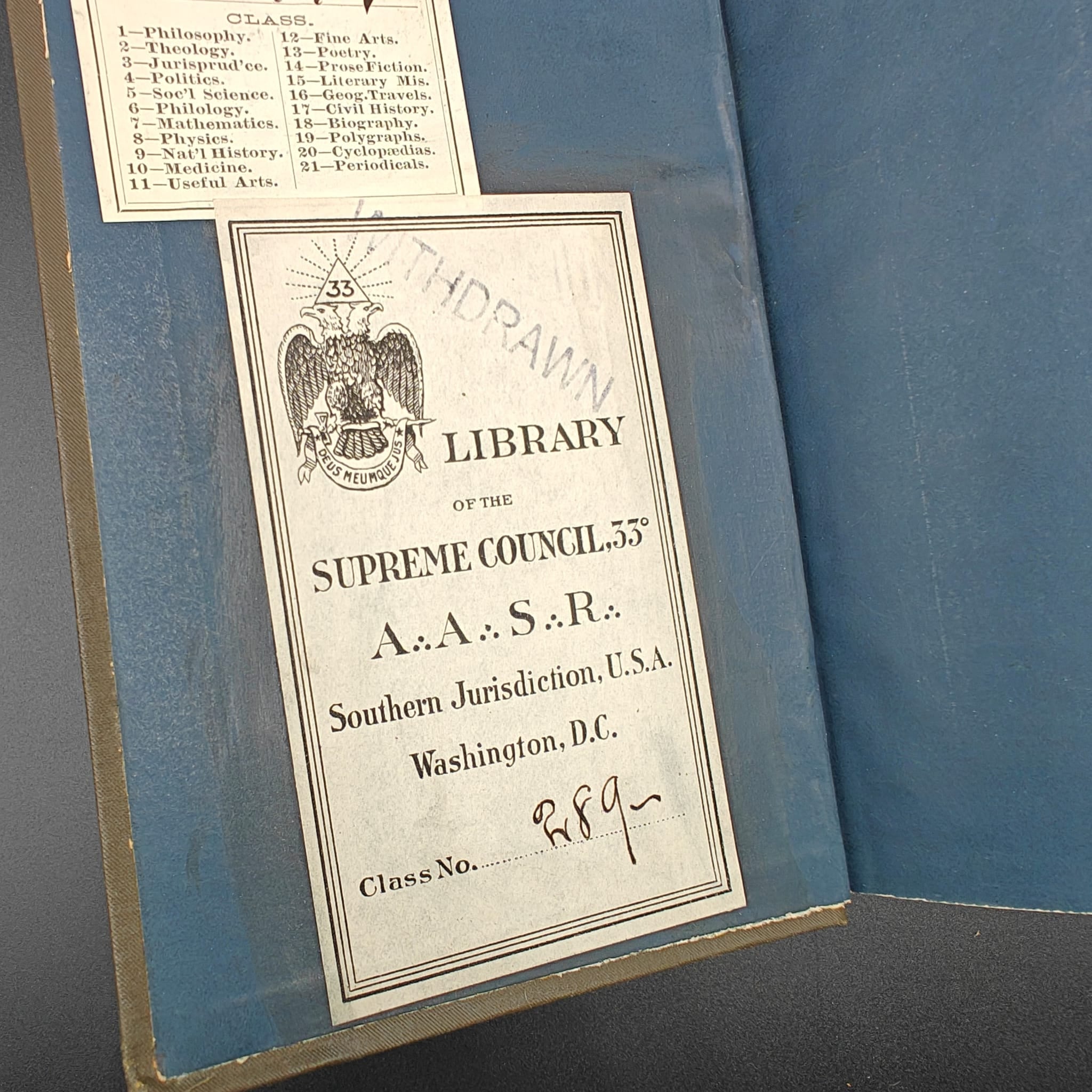 Bookplate of the private library of William T Harris; Bookplate of the Library of the Supreme Council, 33, AASR [Ancient and Accepted Scottish Rite], Washington DC (withdrawn).