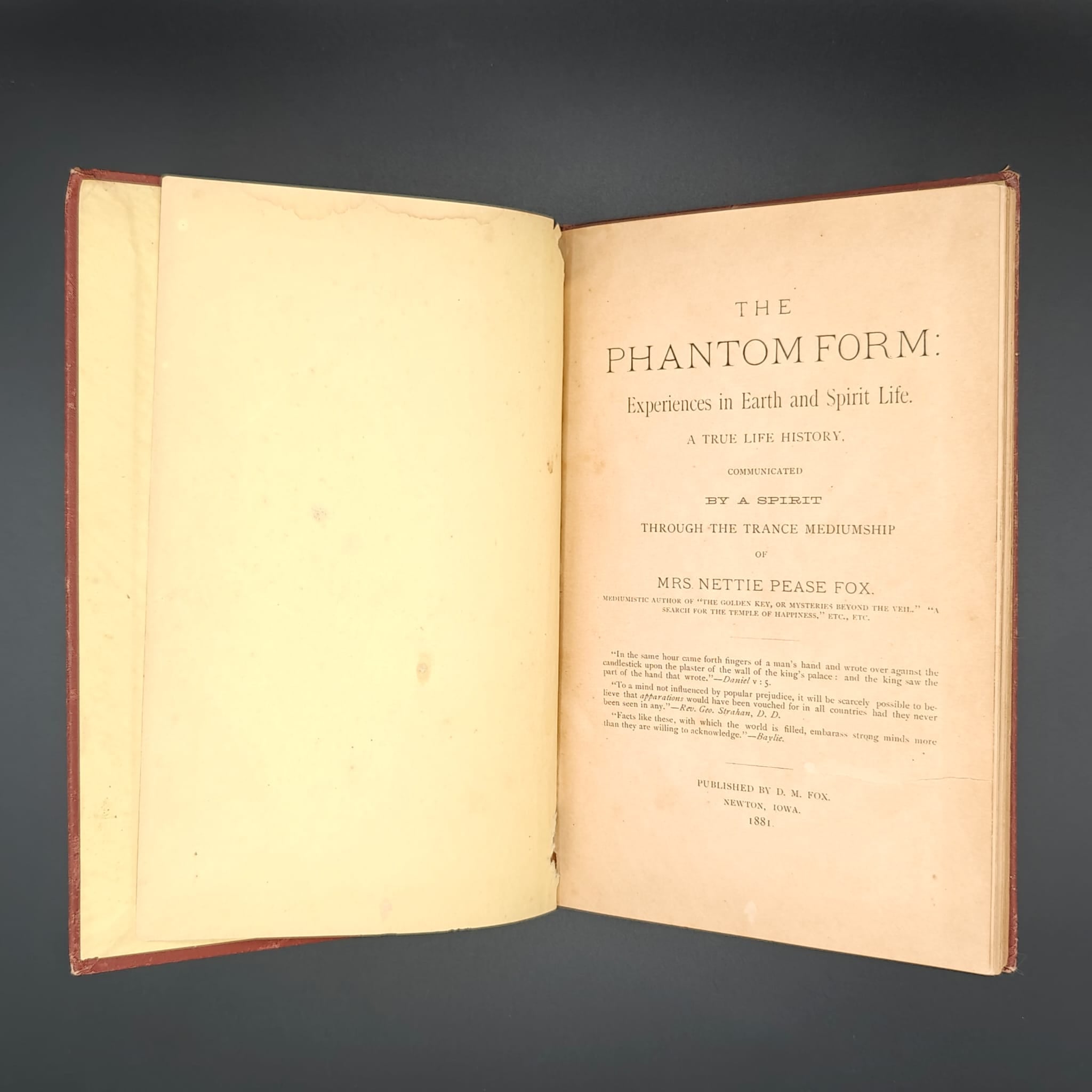 Nettie Pease Fox. The Phantom Form : Experiences in Earth and Spirit Life. A True Life History. Communicated by a Spirit through Trance Mediumship of Mrs Nettie Pease Fox. Published by D. M. Fox. Newton, Iowa: 1881.
