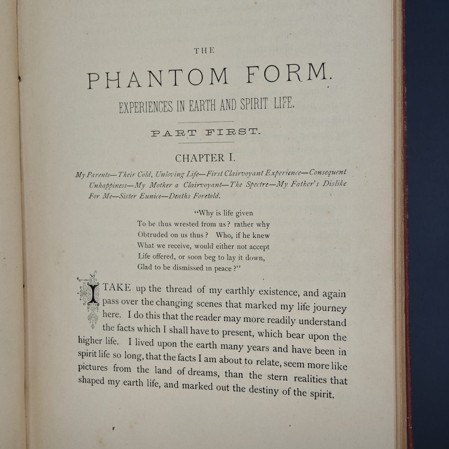 The Phantom Form: Experiences in Earth and Spirit Life (1881) is a 19th-century spiritualist text detailing life after death, communicated through the trance mediumship of Mrs. Nettie Pease Fox. It purports to be a true narrative of a spirit's experiences, providing insights into spiritual realms and personal history.