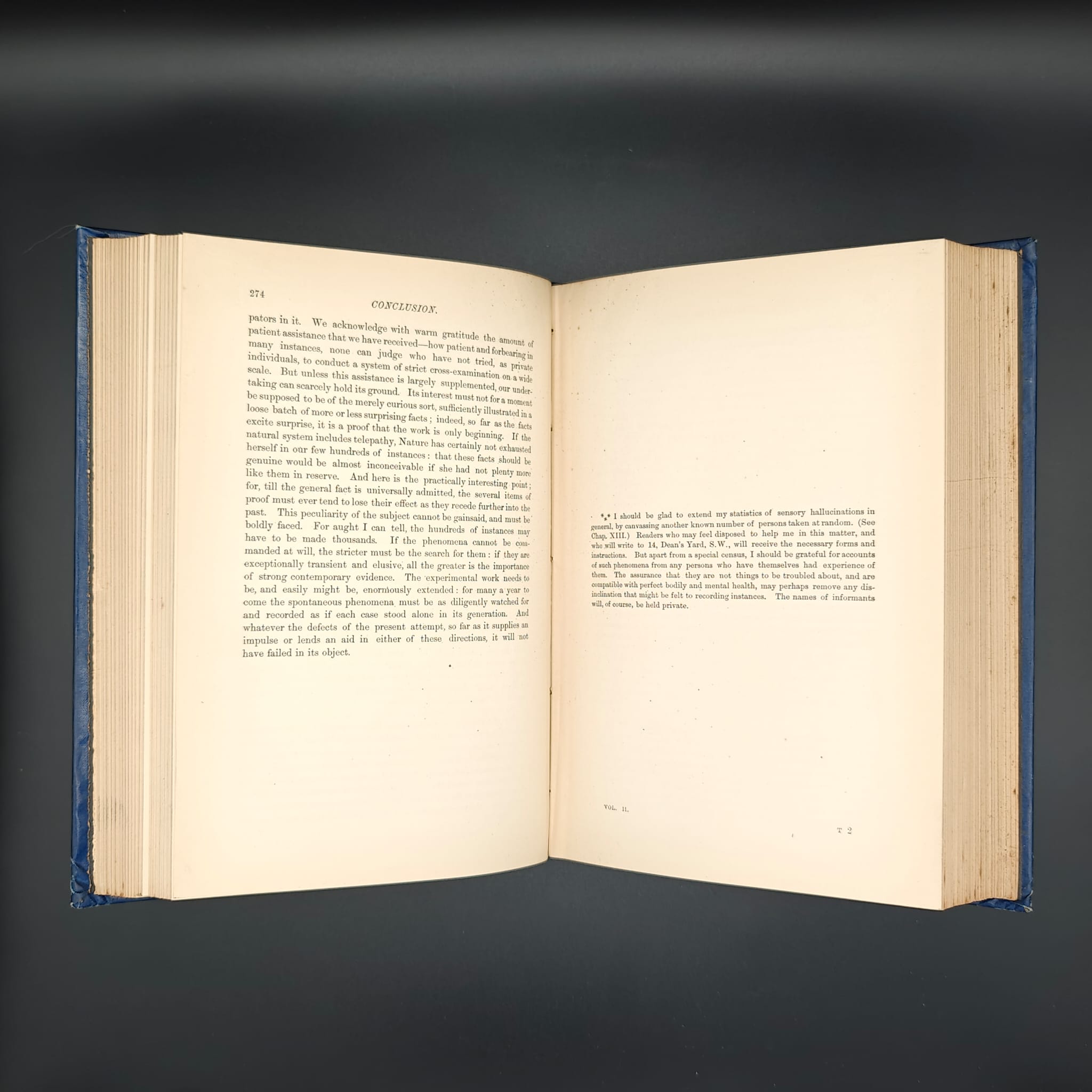 FIRST EDITION, second issue as usual. Two vols, (230 x 165 mm) pp. lxxxiv, 573, [1]; xxvii, [1], 733, [1], with half-titles. Illustrations of phenomena throughout. Publisher's blue cloth binding with gilt title on cover and title/authors/vol on spine. Some scuffing on fore edges, some minor white spots to cover and spine. Overall a VERY GOOD copy containing much of the early work of the Society for Psychical Research, documenting over 700 cases studies of ghosts, and covering telepathy, hypnotism, dreams, hallucinations, &c.