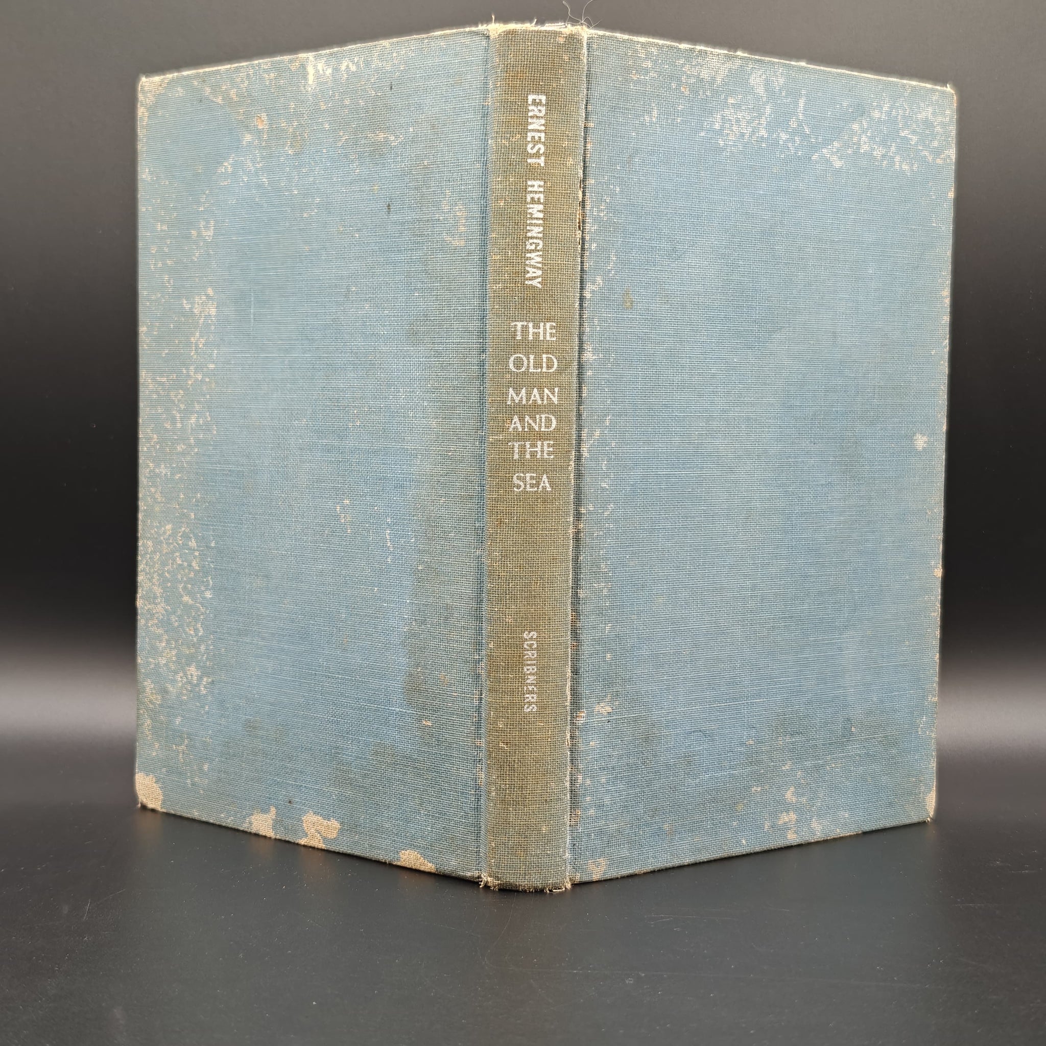 First edition, first state (210 x 145 mm) pp. 140. Follows FEP's guides for a true first (not Book Club or later)- A on copyright statement page above Scribner's seal and blank below; blue publisher's binding with embossed Hemingway signature in lower righthand corner. UNFORTUNATELY, lacks DJ entirely and the covers have sustained the damage of time with spotting and fraying to fabric. Internally, some spotting. Maybe a nice rebind job for a Hemingway fancier. Overall condition FAIR.