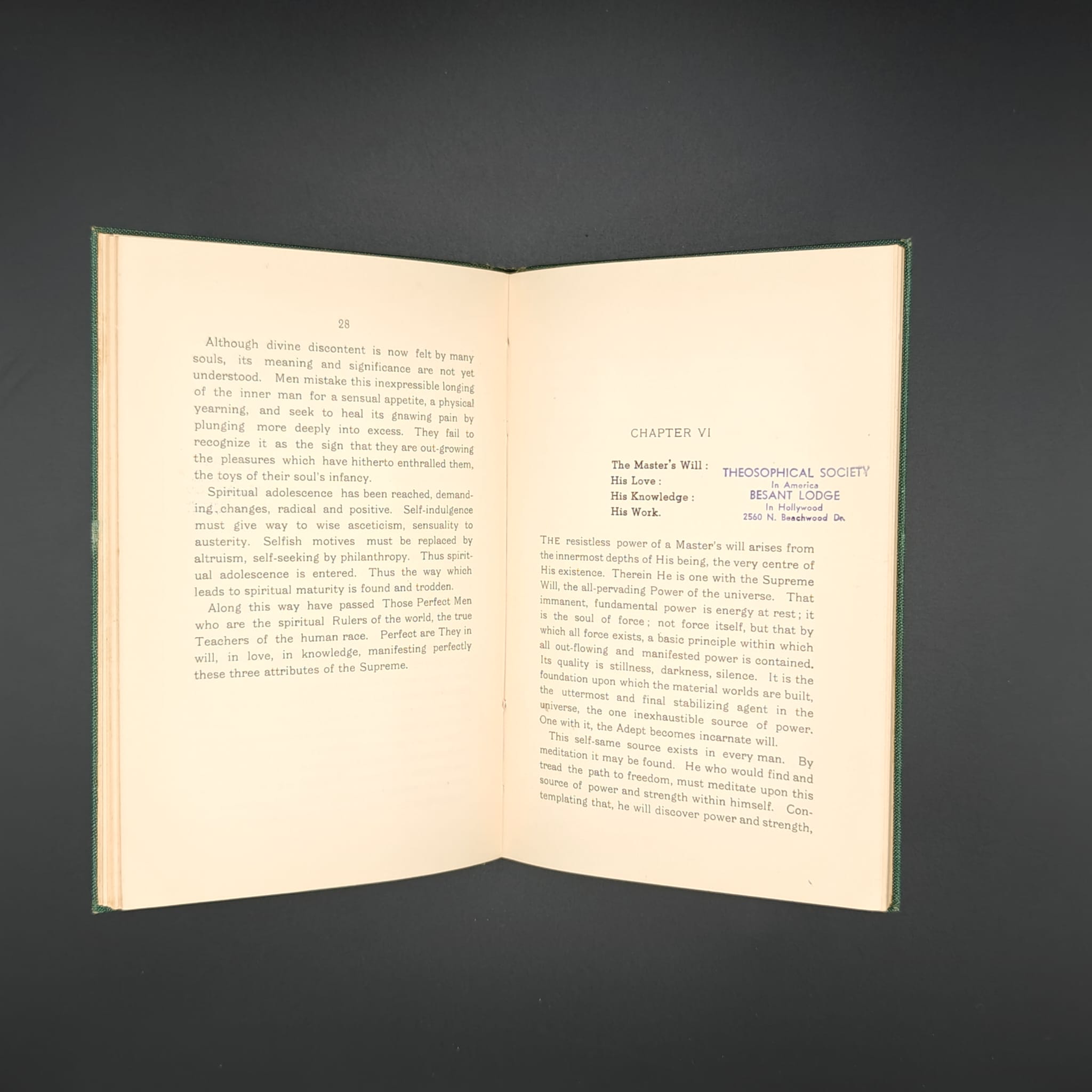 Well documented provenance: stamps throughout from Theosophical Society in America, Besant Lodge, in Hollywood; Bookplate on front paste down of Nina Jamison of the Rosicrucian Fellowship, Mt. Ecclesia, Oceanside, CA; Henry Hotchner stamped on end fly leaf.