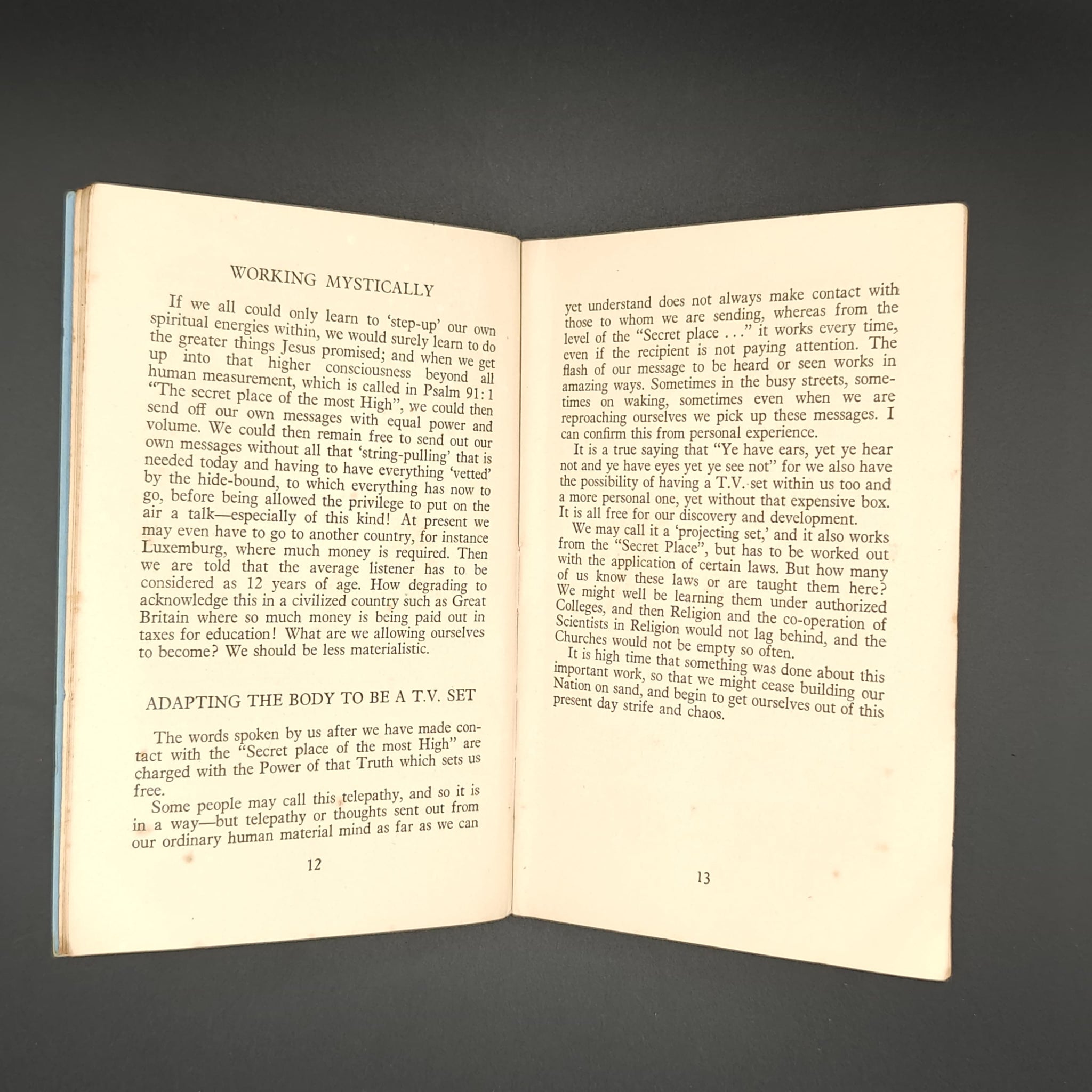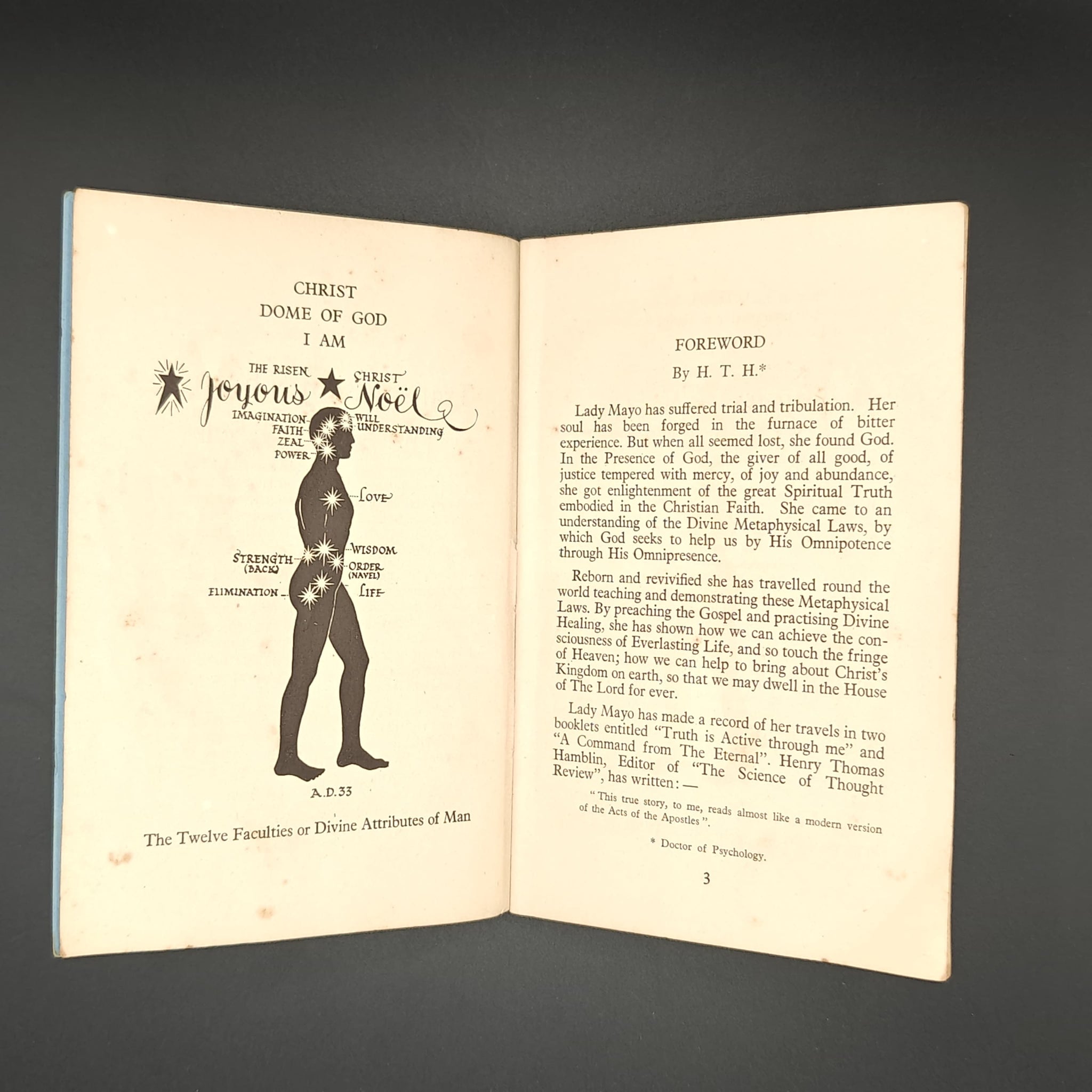(180 x 120 mm) pp. 35. Staple bound pamphlet bound in blue card with transmittor tower on cover. Frontispiece of twelve factulties or divine attributes of man; centerfold of illustration of Tree of life; illustrations of chiropractory (p. 26, 27). Overall GOOD