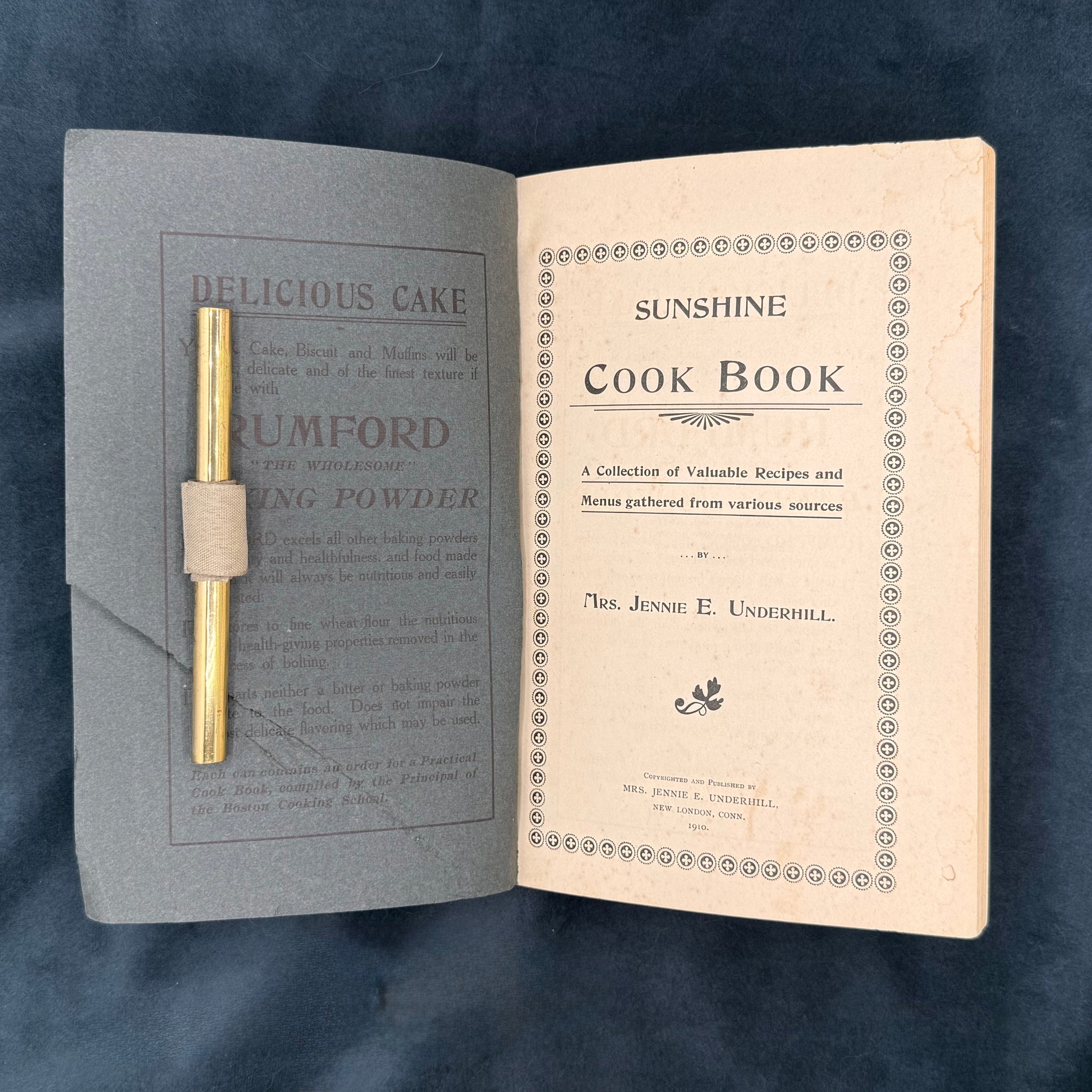 Underhill, Jennie. Sunshine Cook Book: A Collection of Valuable Recipes and Menus from Various sources. New London: Mrs. Jennie Underhill, 1910.