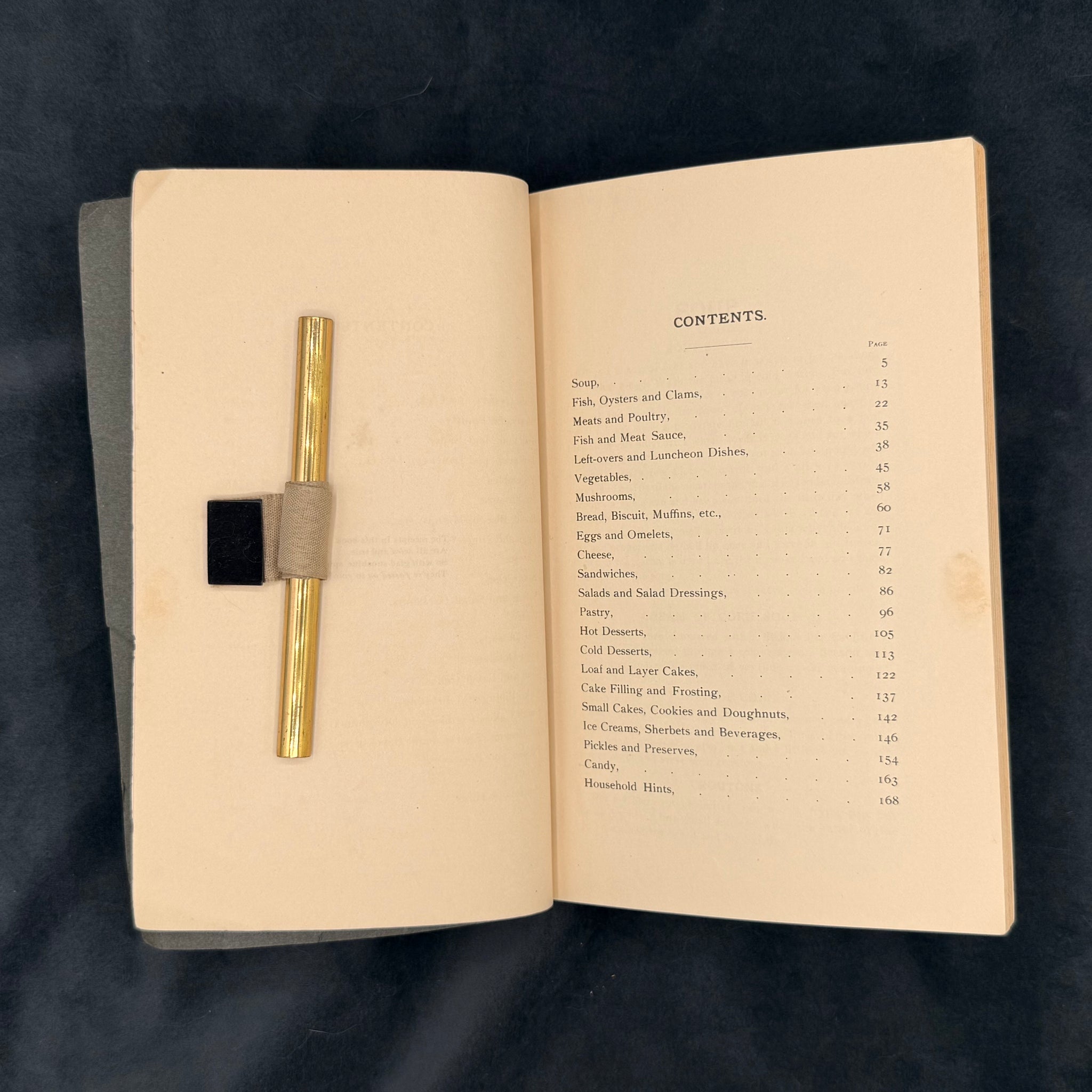 Codfish puff, Toast, Egg Gems, Sally Lunn, Lottie’s Scrapple, Shirred Eggs, Tabasco Eggs, Household Hints (To stop mouse holes, to destroy bed bugs, to remove ink spots from a thin white dress)
