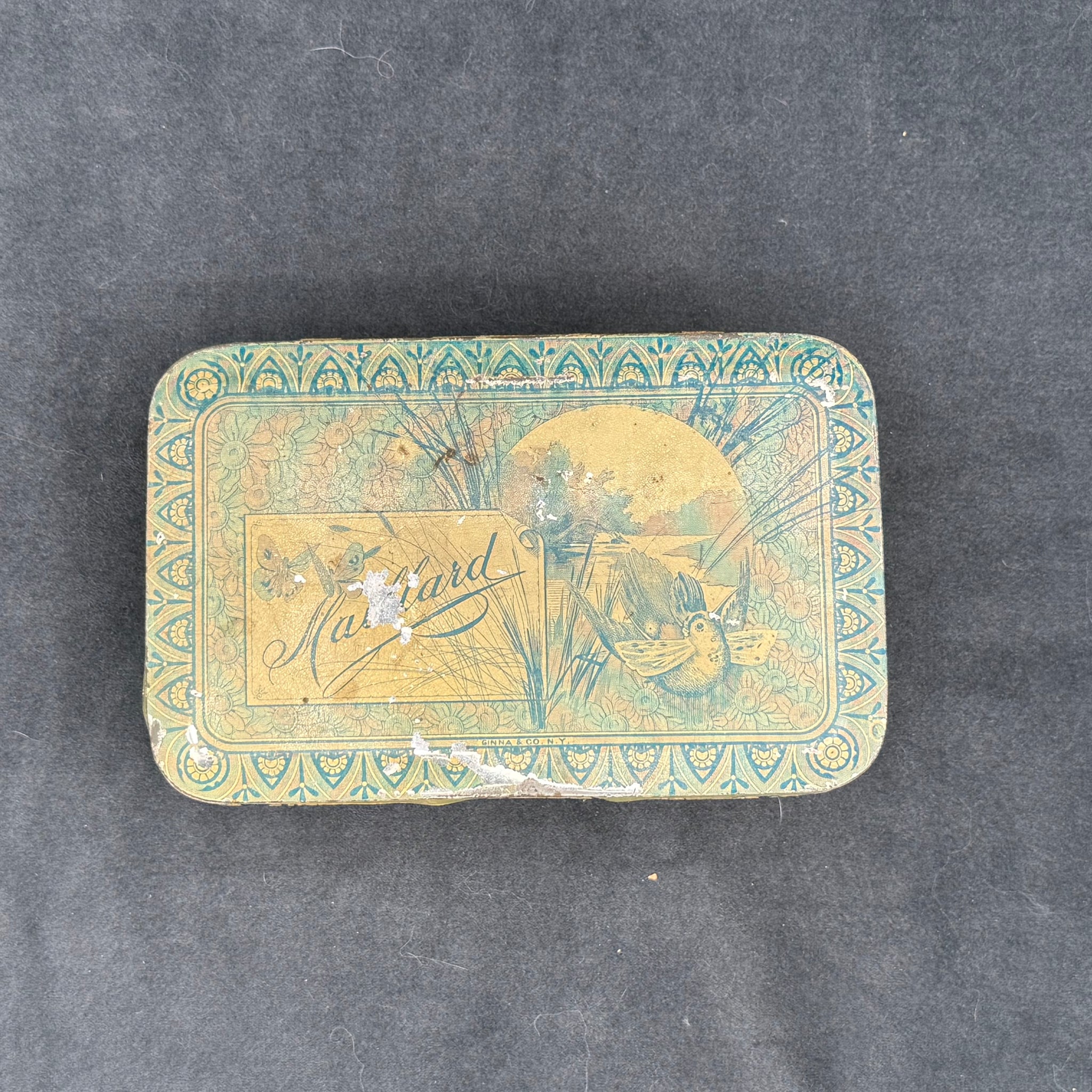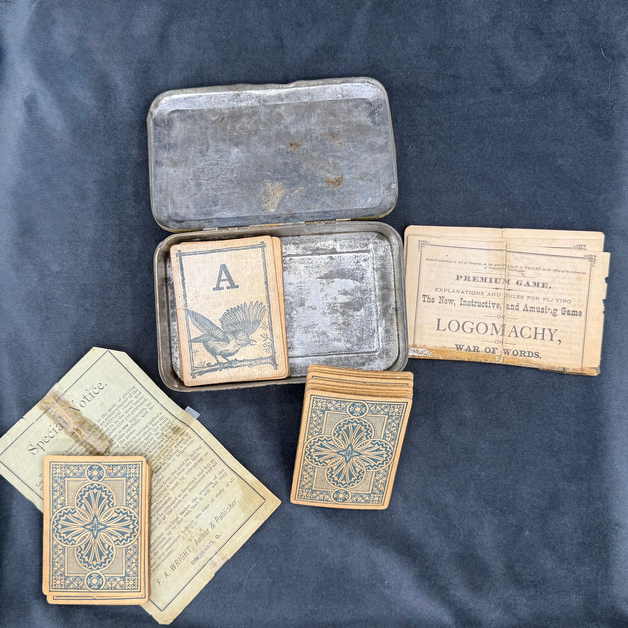 (90 x 65 mm) Two complete decks of 56 cards each. 4 vowel cards, 2 consonant cards, 1 card for rarer letters (J, K, Q, V, X, Z). Each card framed in border of sticks, most decorated with songbird with outstretched wings; rarer letters with different decorative scenes. Some cards have small nicks to edges or are faded, one deck has several cards with historic tape repairs. No original box. Original instructions and Special Notice with historic tape repairs and splits. Condition suggests use as game. Housed in Ginna & Co. New York single-color, green, lithographic tin with Mallard business name and decorative vignettes, ca. 1874-1901. Overall GOOD condition.